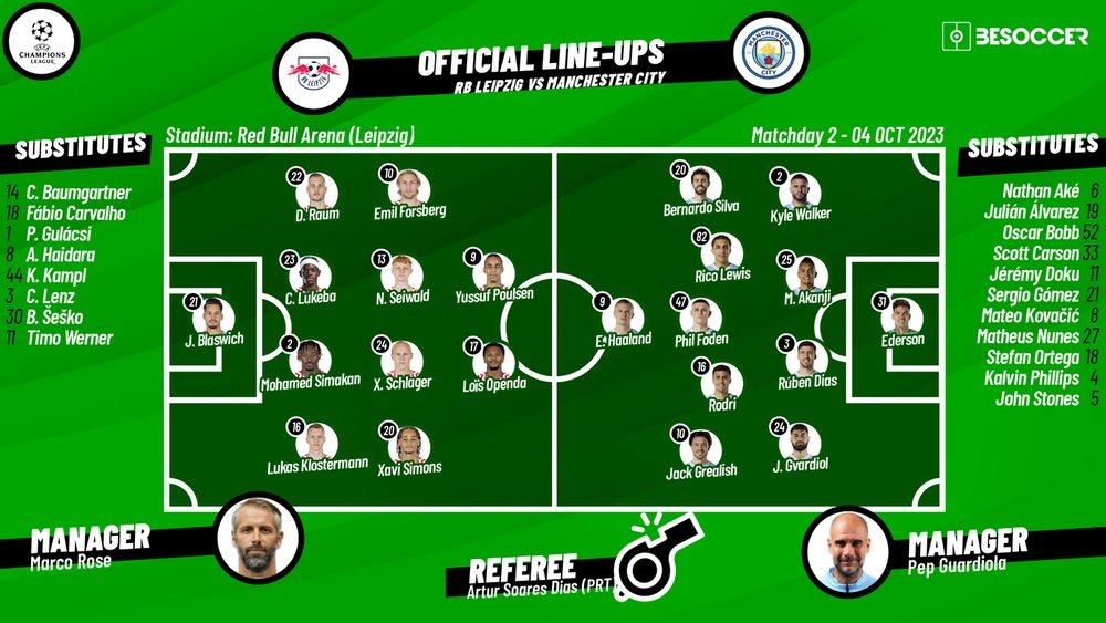 View the starting lineups and subs for the Man City vs RB Leipzig match on 28112023 plus access full match preview and predictions. View the starting lineups and subs for the Man City vs RB Leipzig match on 14032023 plus access full match preview and predictions. Nathan Ake Ruben Dias Jon Stones Manuel Akanji Rodri Ilkay Gundogan Jack Grealish Kevin De Bruyne Bernardo Silva. . 03-14-2023 21 min read Getty Images ETIHAD STADIUM MANCHESTER Erling Haaland plundered an astonishing five-goal haul as Manchester City stormed into the Champions League..